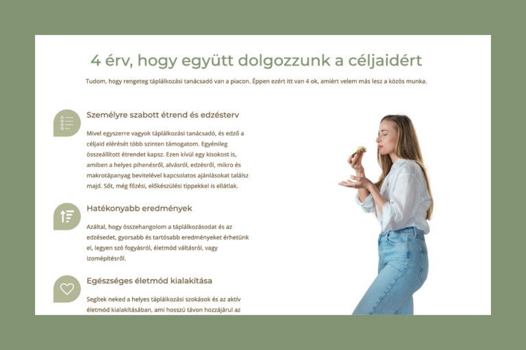 Dorka egyszerre nyújt segítséget az edzésben és a kiegyensúlyozott táplálkozásban. Weboldalának szeretett volna egy letisztult, mégis elegáns megjelenést.